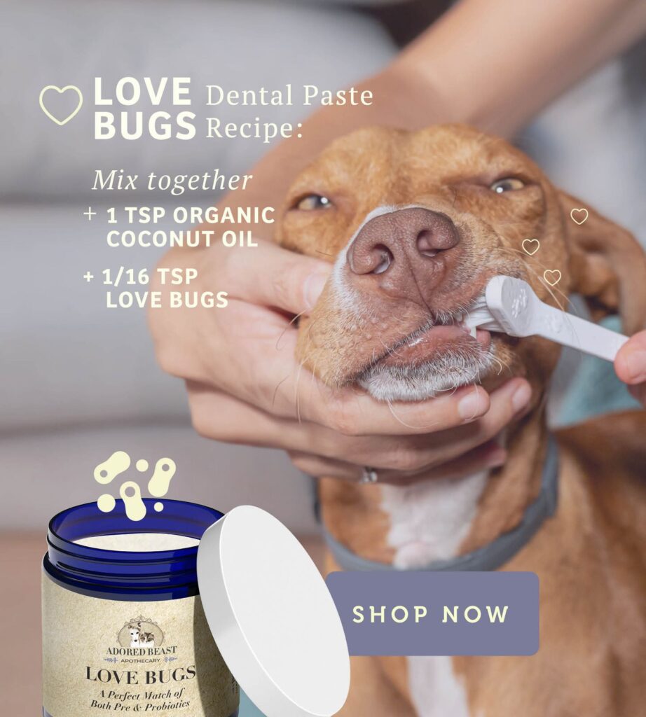 If you have the ability to get right in there, that’s best. However, if your animal is really fearful, for whatever reason, don’t force it. Some animals just can’t handle your hands in their mouth, whether from past experiences or just because they’re adverse to the feeling. In this case, you can try coconut oil and Love Bugs popsicles – just add the recipe to an ice cube container and freeze. You may want to add some of your favorite bone broth for flavor. Or, just put a little Love Bugs in the water bowl. We don’t want to cause any more stress in our animals, and this takes the pressure off. The probiotics will still get to where they need to be!
